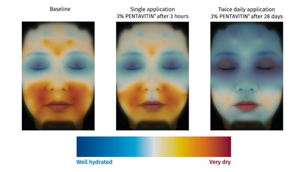 S pomocou technológie na vizualizáciu hydratácie pokožky tváre bolo vykonané meranie hydratácie pleti po aplikácii Pentavitínu. Najprv po troch hodinách po jednorazovej aplikácii 3% Pentavitínu, kedy už bolo zrejmé zvýšenie hydratácie v oblasti čela, očí a tvárí. Druhé meranie bolo vykonané po 28 dňoch, kedy bol 3% Pentavitin aplikovaný dvakrát denne, zlepšenie hydratácie pokožky posúďte sami: