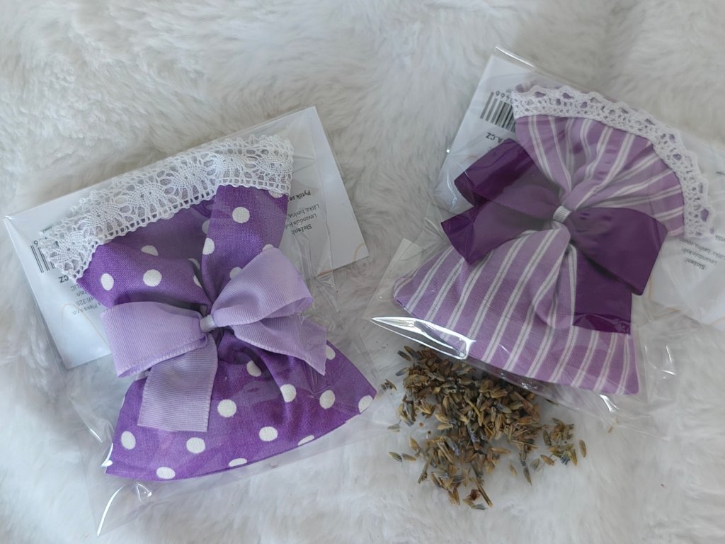 sušené kvety levandule v elegantnom fialovom vrecúšku s motívom levandule, ktoré príjemne prevonia váš domov,